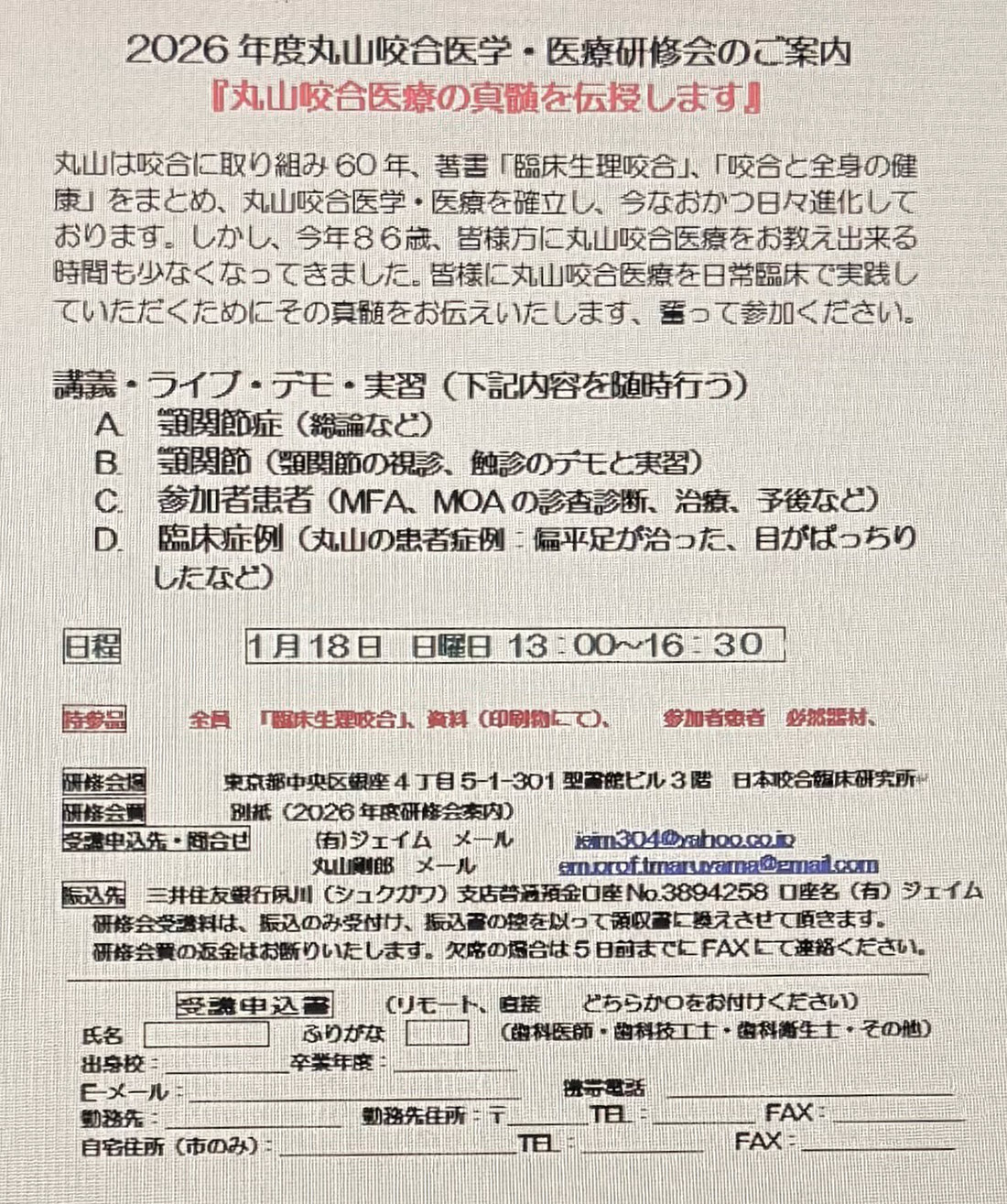 歯科医師から一般市民に至るまで、幅広く丸山咬合医学・医療を認識して頂きたいと考え、このように年間を通して様々な研修会を計画しております。皆様のご参加こころよりお待ち致しております。